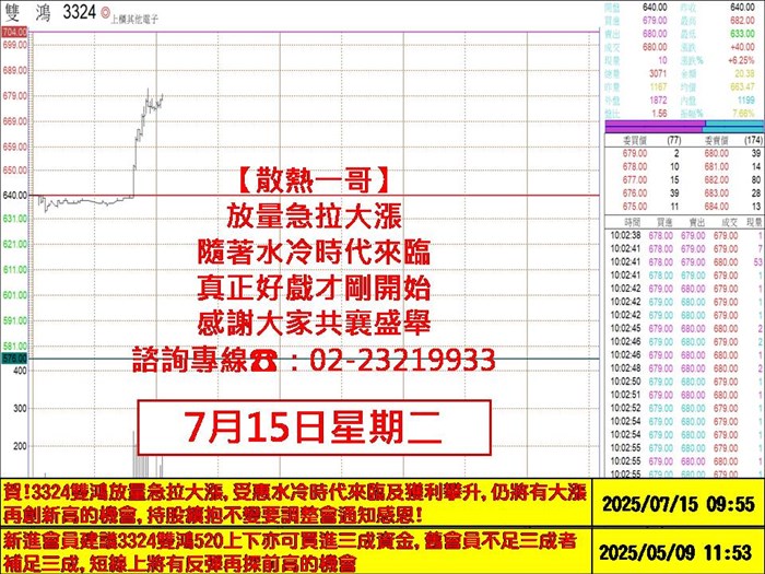 至於個股方面,多方聚焦的主軸就是看『AI』,盤面會說話,從銅箔基板台光電、台燿、PCB金像電、伺服器機殼勤誠、半導體測試介面旺矽、AI連接器貿聯-KY、玻纖布富喬、德宏、散熱奇鋐、BBU概念股新盛力、CPO環宇-KY、AI電源台達電、無塵室設備漢唐…等狂飆大漲的帶動下,今日包括銅箔基板聯茂、CPO全新、創威、華星光、聯鈞、BBU概念股AES-KY、散熱雙鴻、ABF載板南電、欣興、景碩、電子零件金居、檢測閎康、設備股華景電、群翊…等個股,也跟進同步大漲上來、甚至強勢亮燈漲停板,很明顯法人大戶聚焦的主軸與重心仍是圍繞在『AI』不變;尤其美國總統川普將於周二在賓州宣布投入700億美元發展人工智慧與能源產業,這是白宮加速新興科技發展的最新舉措,以及美政策轉彎!輝達H20晶片可望獲准銷陸,顯見AI商機無限方興未艾,這些都是大家的機會,更多第一手訊息及飆股機會,老師也都會在飆股鑫天地LINE@或TG的群組裡,隨時追蹤分享,感恩!