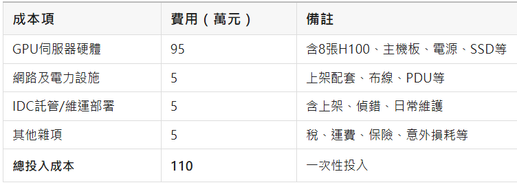 以一台搭載8張H100的伺服器為例,市場價格約 110萬元人民幣(含機櫃、電源、網路等配套裝置),我們來拆一拆帳本: