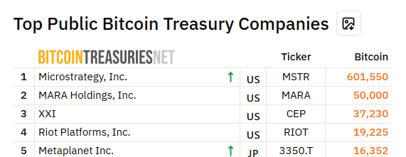 根據 Bitcointreasuries 數據,Metaplanet 目前位居全球第五大比特幣企業持有者,僅落後於 Strategy(原 MicroStrategy)、Marathon Digital(MARA)、Twenty One 和 Riot Platforms。排名第一的 Strategy 持股高達 60.1 萬枚 BTC,遙遙領先。