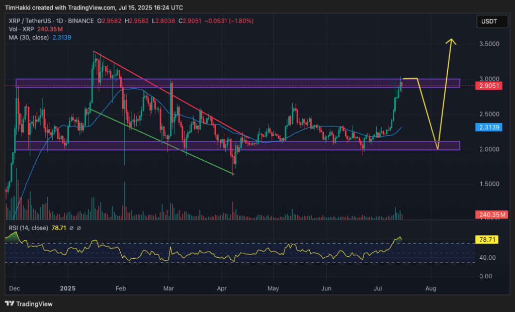 技術圖表顯示,XRP自1月到4月形成了明顯的看漲旗形形態,預示著強勁的上升動能。然而,隨著其相對強弱指數(RSI)達到79,短期內可能會出現回調,因為交易者傾向於在周末獲利了結。