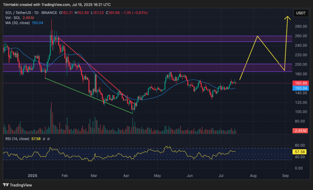 從技術面來看,Solana已成功扭轉先前的下跌趨勢。今年1月曾高於$250,但4月時一度跌至接近$100,然而近期已突破下降楔形形態,這是一項強烈的看漲訊號,目前SOL價格約為$161。