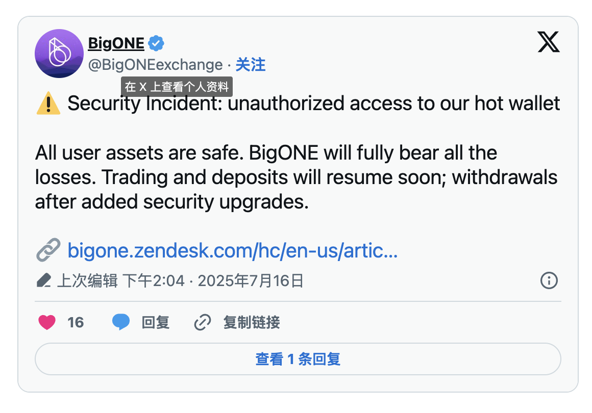 加密貨幣交易所 BigONE 今日(16 日)確認平台熱錢包遭駭客攻擊,損失金額約 2,700 萬美元。官方強調,所有相關損失將由平台承擔,用戶資產不受影響。