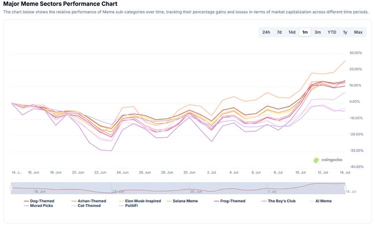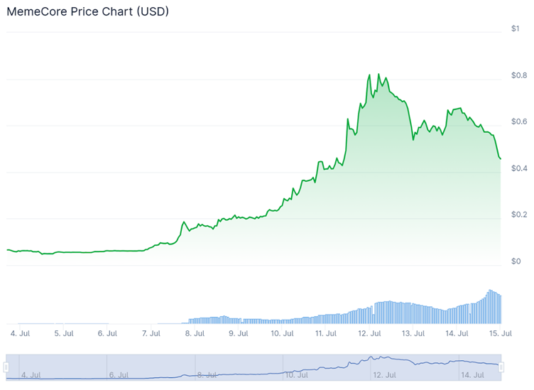 同時,一些冷門計畫的漲幅更為驚人。 MemeCore(M)自 7 月 3 日以來已暴漲 598%,背後推力主要來自其專為迷因幣打造的 Layer1 公鏈所引發的市場熱炒。這種極端的行情波動,令人聯想到 2023 年中那波「高度投機情緒」主導的狂熱牛市。