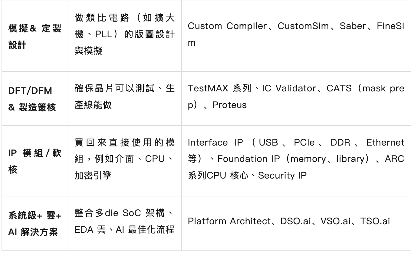 Synopsys的核心競爭力在於-把EDA、IP、光學、軟體安全等「晶片與系統設計」各環節打通,形成一個高度整合且不斷創新的平台,為全球半導體設計製造保駕護航。 (Techcoffee)