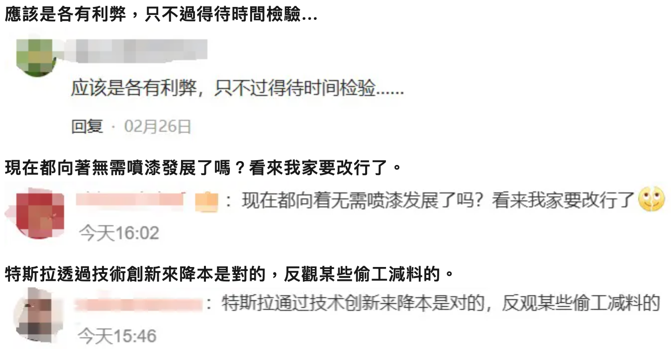 現在特斯拉的玩法是車身顏色會在生產過程中直接注入,換句話說,你看到的顏色不是「噴」上去的,而是材料本身就已經帶色,例如陽極氧化鋁、預著色塑膠、鍍膜複合材料等。車身從裡到外都是同種顏色,如果發生碰撞或剮蹭,外觀顏色不會被磨掉要補漆,傷到的地方只需要做凹痕處理,打磨拋光一下就可以了,新的地方顏色自己會顯出來。