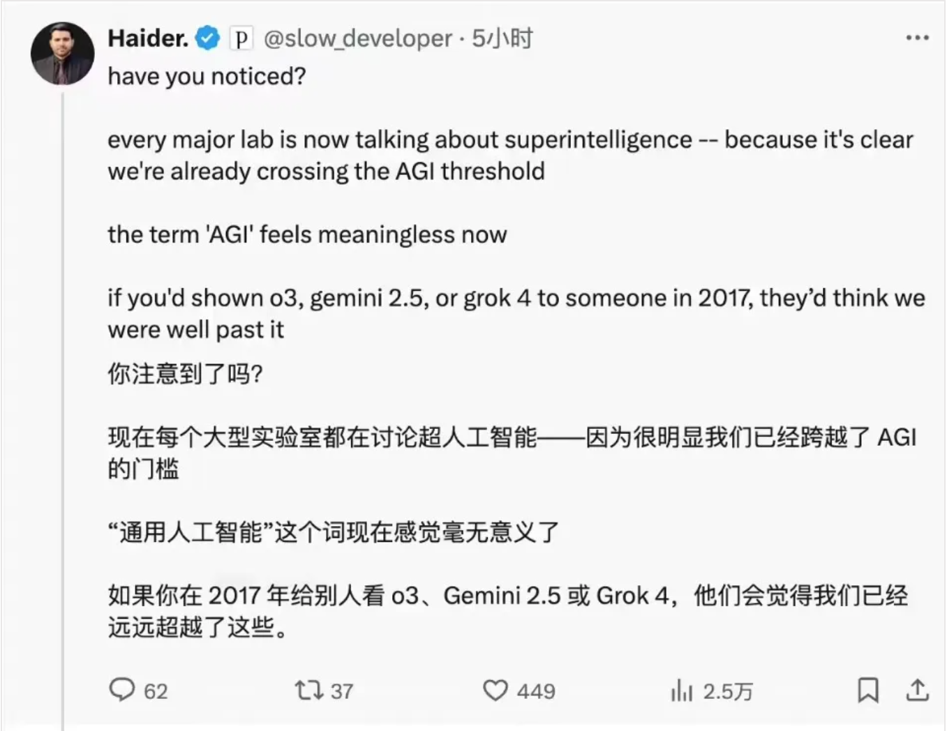馬斯剋日前在X平台上“瘋狂輸出”,在回覆一名博主Haider有關AGI的觀點時表示,AI已經“比大多數人聰明得多”了,但並沒有“在任何領域都超越任何個體人類”。
