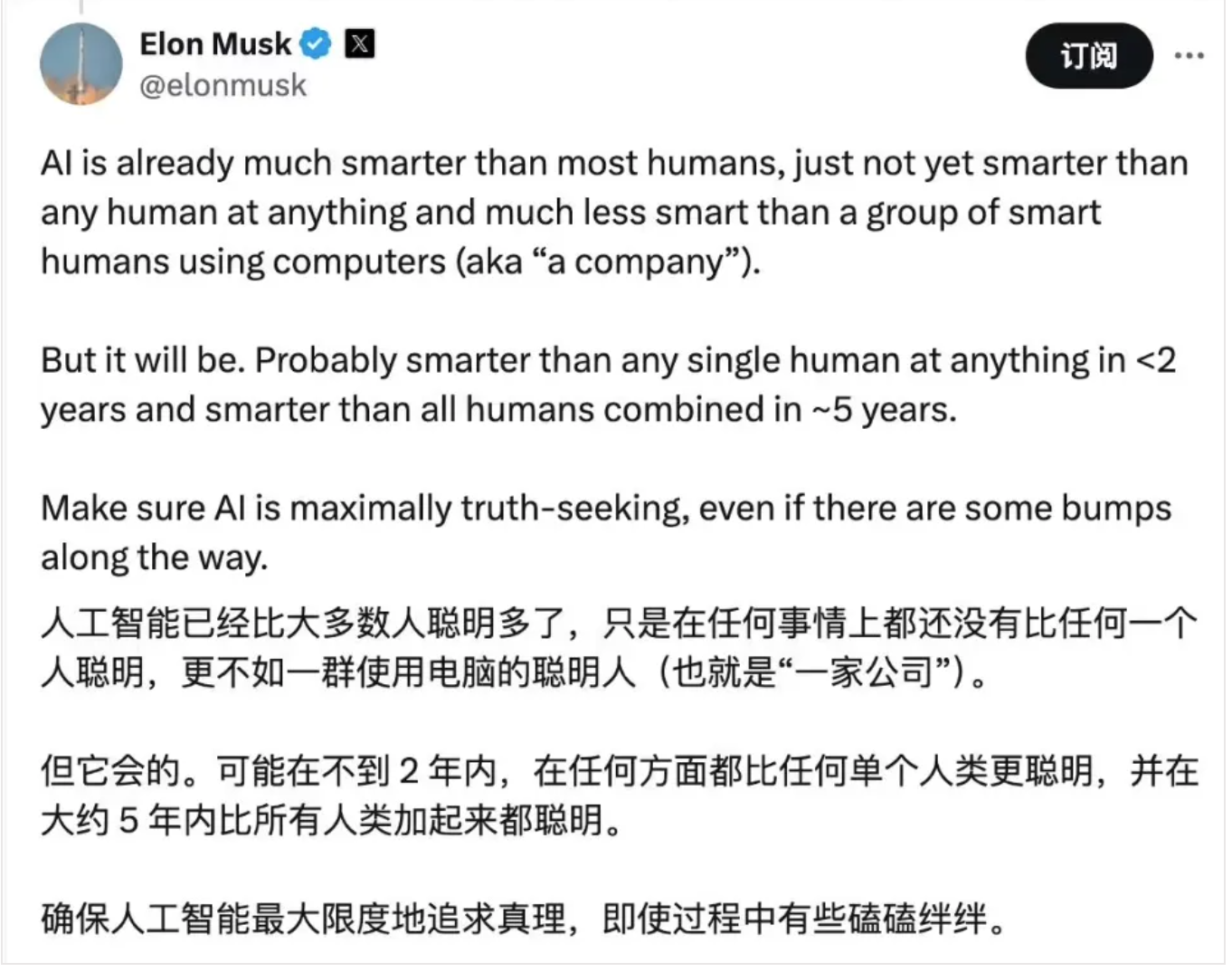 不過這種情況即將改變。在未來兩年內,人工智慧很可能在任何任務上都能超越個體人類;而在大約五年內,它的能力甚至會超過全人類智慧的總和。關鍵在於確保人工智慧始終以追求真理為最高目標,即使前進道路上難免會出現一些曲折。 」