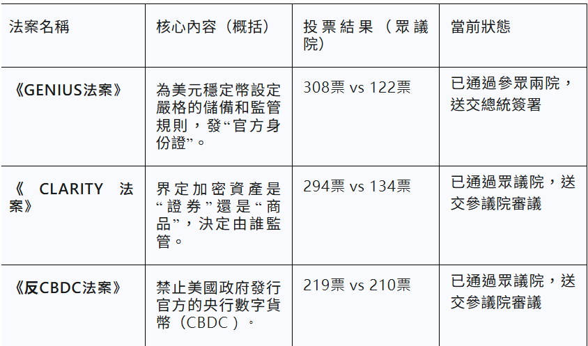 華盛頓剛剛度過了歷史性的“加密周” 。美國國會以前所未有的效率,一口氣通過了三項重磅法案,給全球加密市場投下了一顆“震撼彈”。這三板斧分別是:為穩定幣立規矩的《GENIUS法案》、劃分數位資產地盤的《CLARITY法案》,以及直接封堵官方數字美元的《反CBDC法案》 。