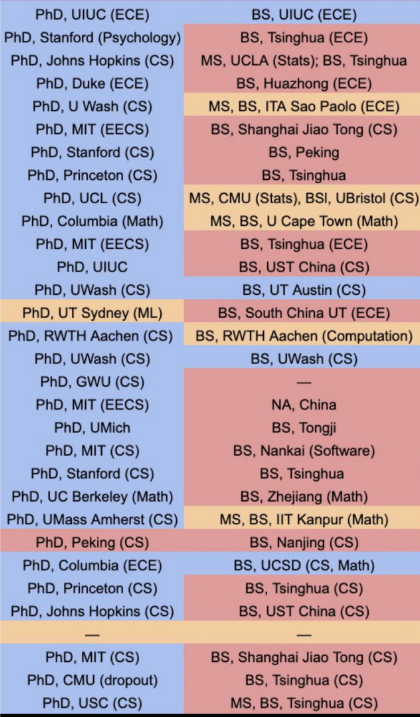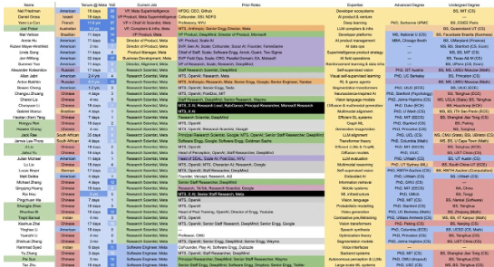 Meta 超級智能團隊全部 44 人的詳細名單。50%來自中國大概有21位來自中國,其中8位清華本科,剩下的都有北大,上交,中科大,同濟,浙大,南大,南開,華科等— 75%擁有博士學位,70%為研究人員OpenAI 佔 40%,DeepMind 佔 20%,Scale 佔 15%— 20% L8+ 等級— 75% 第一代移民這些人每人的年薪很可能在 1000 萬至 1 億美元之間。