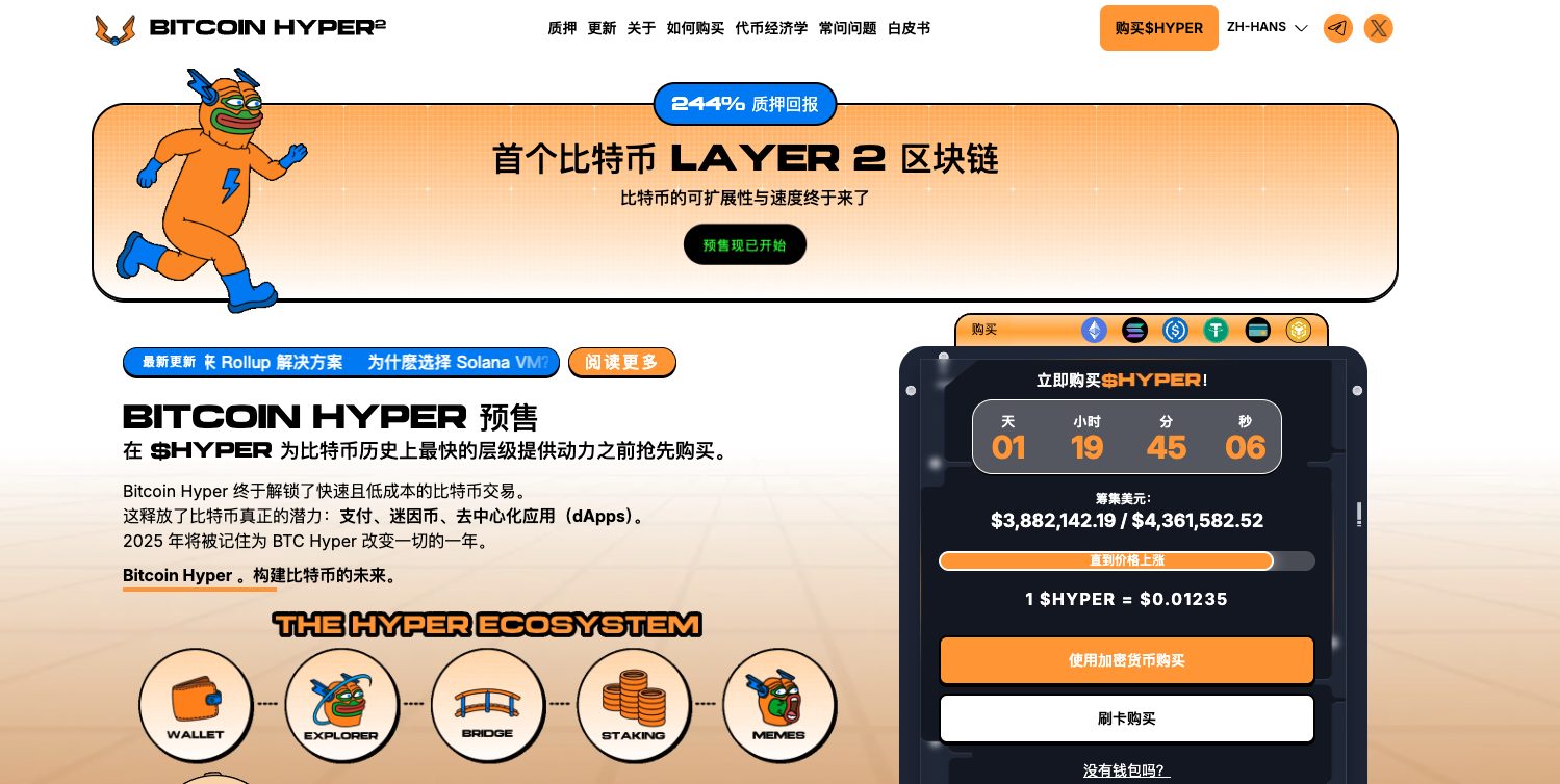 Bitcoin Hyper($HYPER)是基於比特幣網路構建,並導入Solana的高效虛擬機架構,實現低費用、高擴展性與跨鏈流動性。預售至今已募集接近400萬美元,$HYPER代幣目前定價僅0.012325美元。用戶可透過USDT、ETH與銀行卡參與購買,亦可質押HYPER獲得年化395%的收益回報,目前已有逾1.32億枚HYPER被鎖倉。
