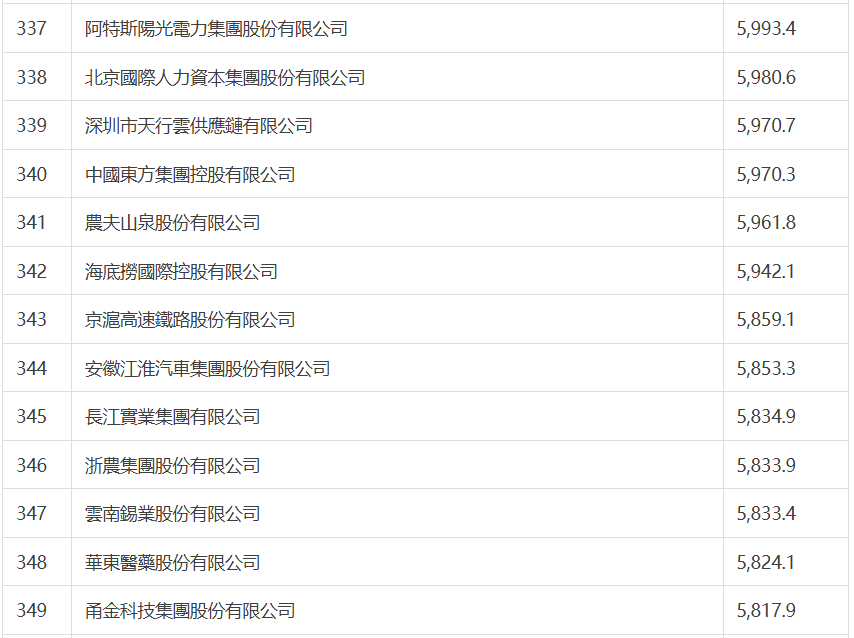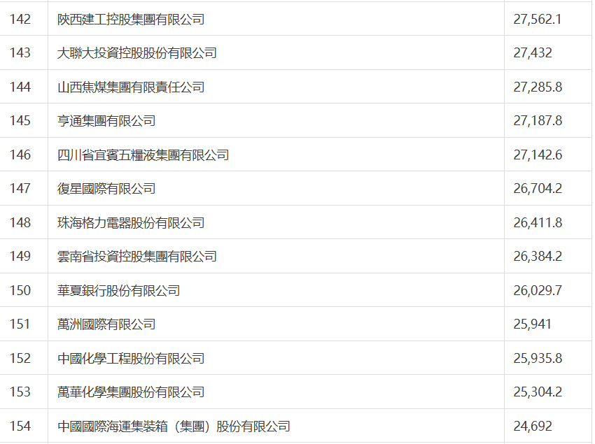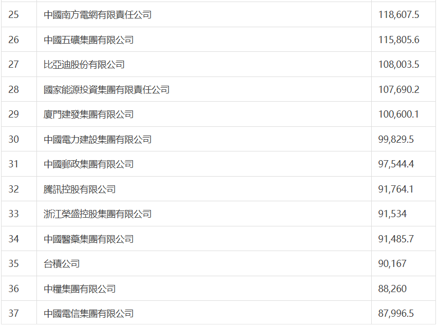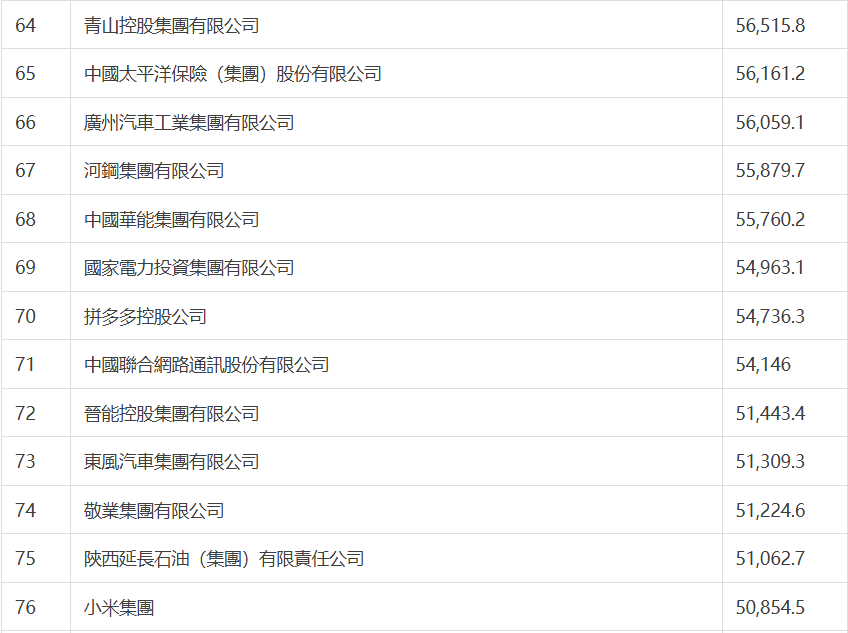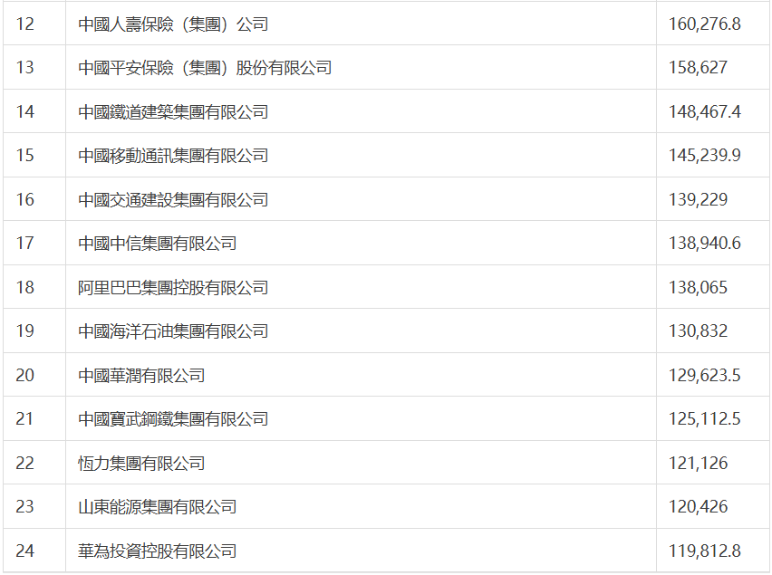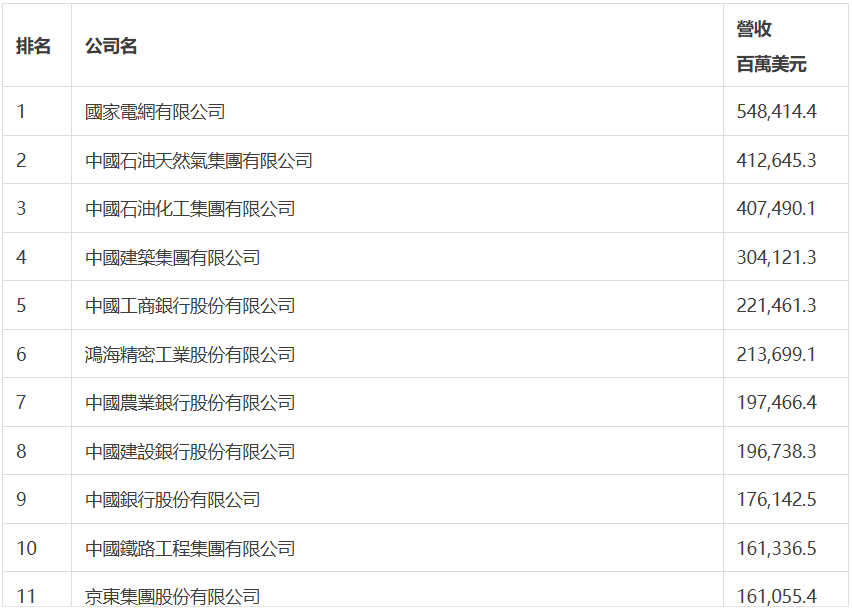 國家電網有限公司以5,484億美元的營收位居榜首,中國石油和中國石化分列榜單第二位和第三位,位列第四位的是中國建築集團,中國工商銀行位列第五。蘋果最大代工企業鴻海精密位列第六,較去年上升1位,仍是排名最高的台灣地區公司。今年前十位中,沒有大陸民營企業。京東集團位列第11位,較去年上升2位,仍是排位最高的大陸民營企業。