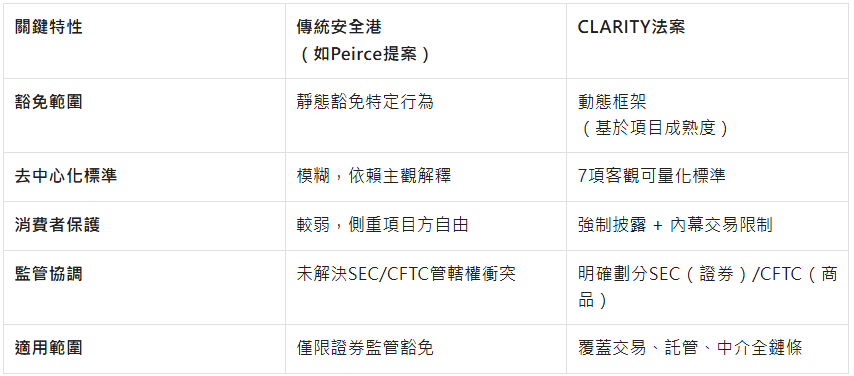 CLARITY法案可視為安全港機制的進階版:通過動態框架和客觀標準,解決了傳統安全港的模糊性,平衡創新與保護;但也有遺憾,保留州級監管、反洗錢等挑戰,需後續立法補充。