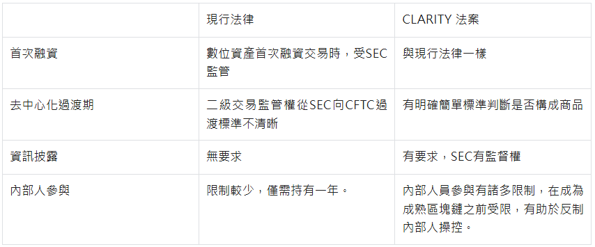 現行法律和《CLARITY 法案》(如果通過)關於區塊鏈系統的獨特屬性規範比較如下。