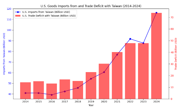 A combination line and bar chart illustrating the steep climb in both U.S. imports from Taiwan (line) and the U.S. trade deficit with Taiwan (bars) from 2014 to 2024.