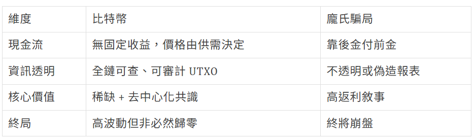 2. 比特幣缺少操盤者與固定收益承諾——開放市場定價 + 透明帳本,使其難以滿足龐氏的經典定義。