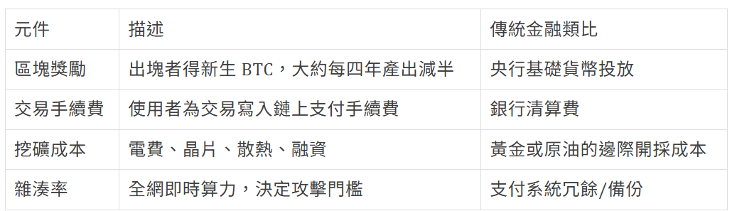 - 解題競賽:礦工不斷呼叫 ASIC 計算雜湊,率先找到滿足難度目標的隨機數即可記帳並獲得新發行 BTC 獎勵。