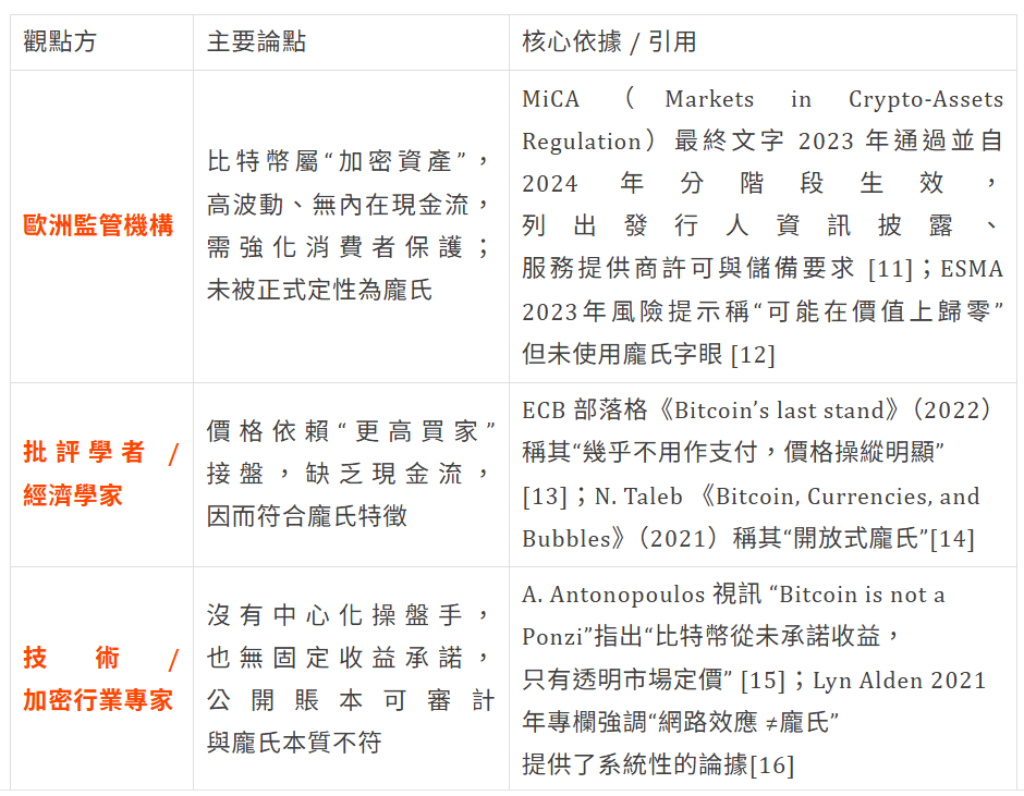 小結:在歐洲 MiCA 框架內,比特幣被視作一種可交易的“加密資產商品”,並未被監管層貼上“龐氏”標籤。儘管學界與央行經濟學家因其高波動與零現金流而提出龐氏質疑,但技術社群用“無中心操盤、無收益承諾、全鏈透明”三點進行反駁。綜合來看,比特幣更像一種高波動的大宗商品或潛在價值儲藏工具,而非經典龐氏結構,但投資者仍應關注價格劇烈波動與合規風險。