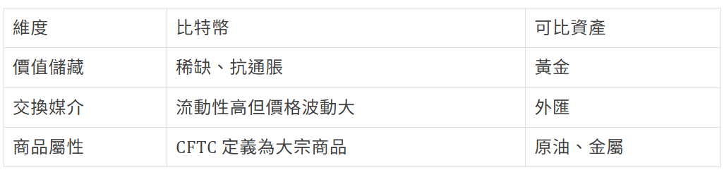 簡明解讀: 把比特幣放到傳統資產籃子裡,它其實同時扮演三種角色——像黃金一樣稀缺,可用來避險通膨與儲藏價值;像外匯一樣 7×24 即時跨境流動,可高效轉移價值,但波動遠高於主要貨幣;在監管層面又被當作大宗商品,相關的合約、託管模式和風險敞口管理邏輯,都可借鑑原油、金屬市場。瞭解這三重屬性,能幫你決定把 BTC 歸入另類避險資產、流動性管理頭寸還是商品交易策略,並據此匹配適當的風險預算與合規流程。