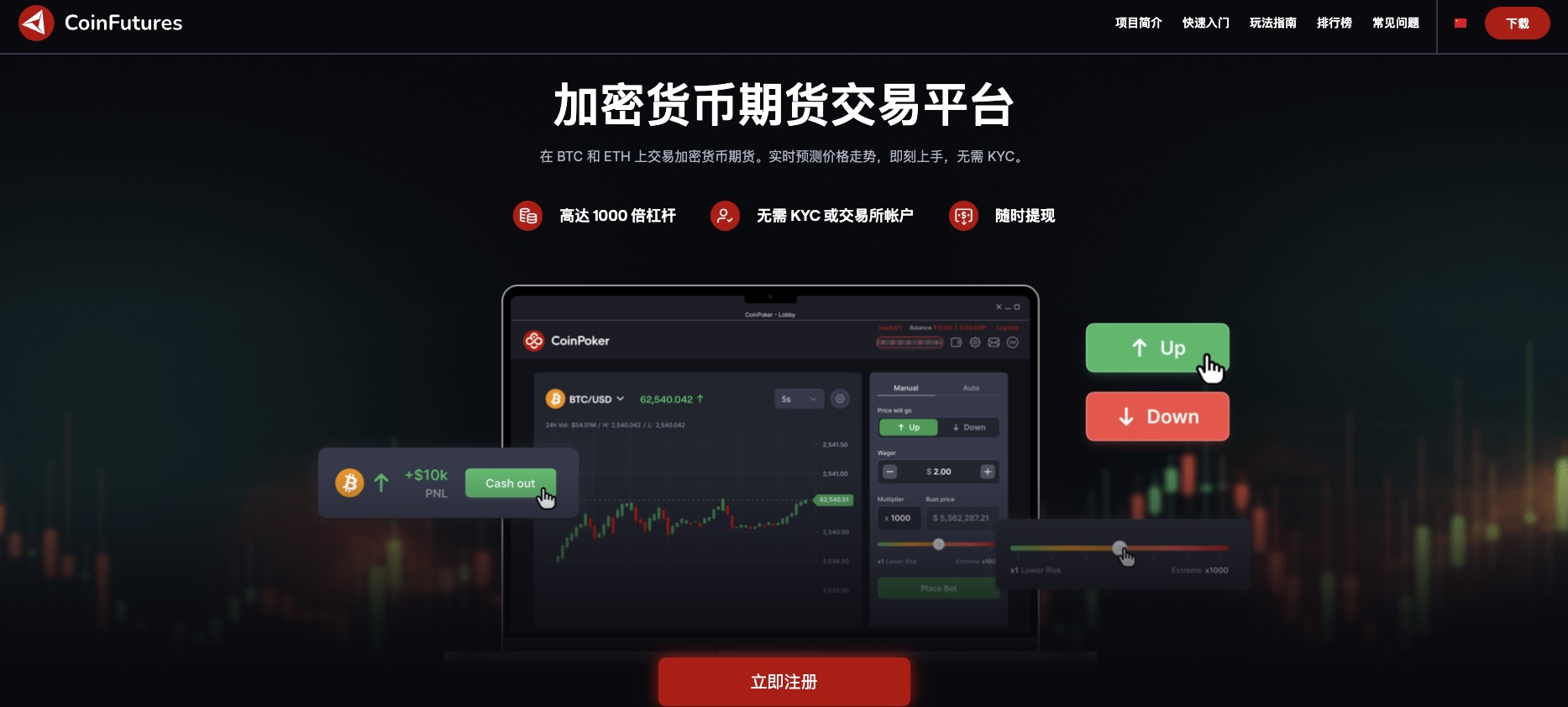 如果想考驗自己對加密貨幣投資眼光,也可使用CoinFutures,這是一個綜合表現優秀的加密貨幣期貨交易平台,主打無需KYC、免註冊帳戶即可交易,並提供仿真真實市場波動的遊戲化交易體驗。用戶可即時預測比特幣、以太幣等主流幣種的價格走勢,並選擇做多或做空,最高可使用達1,000倍的槓桿,亦支援止盈與停損設定。雖然平台不涉及實際加密資產,市場數據為模擬生成,但其高靈活性與免驗證的設計,對短期預測型交易者而言具有吸引力。平台也支援隨時提領收益,操作門坎極低。