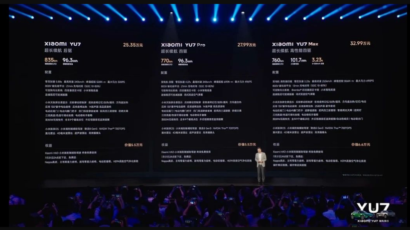 小米汽車首款中大型純電SUV——小米YU7公佈了正是售價,價格區間為25.35-32.99萬元。