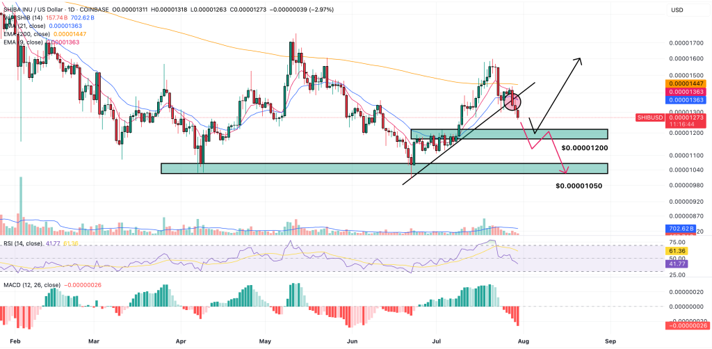 這次看跌突破可能是市場準備迎來更大幅度修正的早期訊號,SHIB價格在接下來的幾天內可能會被推低至 $0.00001050。