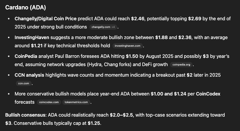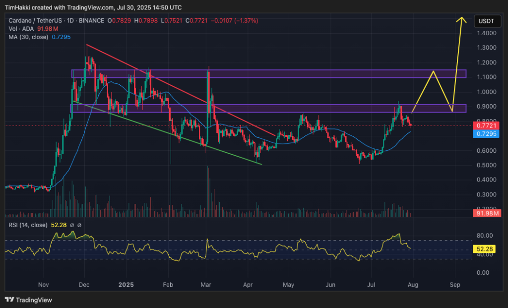 自 2024 年底以來,ADA 一直在下降楔形形態內交易,突破 $1.10 可能會推動其在秋季達到 $1.50。即使沒有大幅多頭市場,達到 $3 目標將使 ADA 接近其在 2021 年最後一次加密熱潮中創下的 $3.09 歷史紀錄。