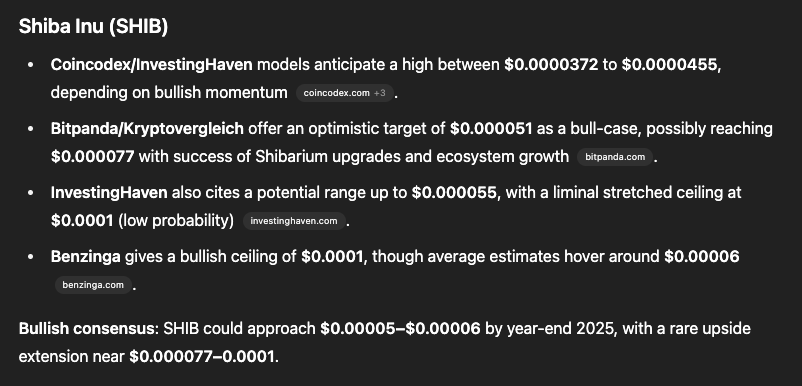 阻力位在 $0.000022 附近,但如果動能持續,SHIB 可能朝 ChatGPT 最看漲的年底預測目標 $0.0001 前進——這代表從當前價格上漲約 8 倍。
