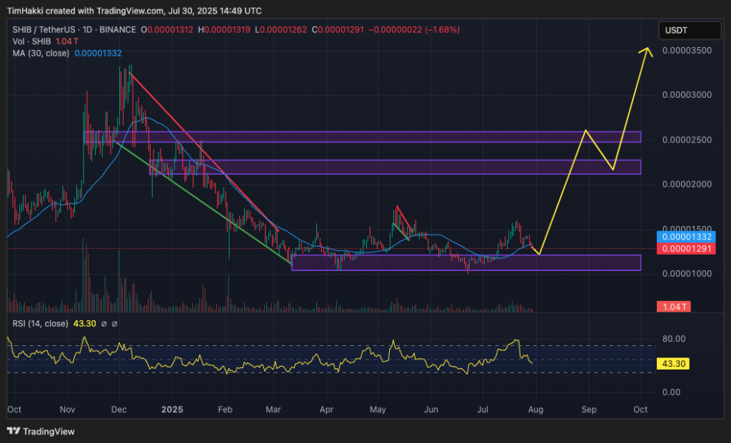 SHIB 目前交易價格約為 $0.00001288,過去一個月上漲了 13%,技術面顯示其可能突破長期下降楔形和近期看漲旗形形態。