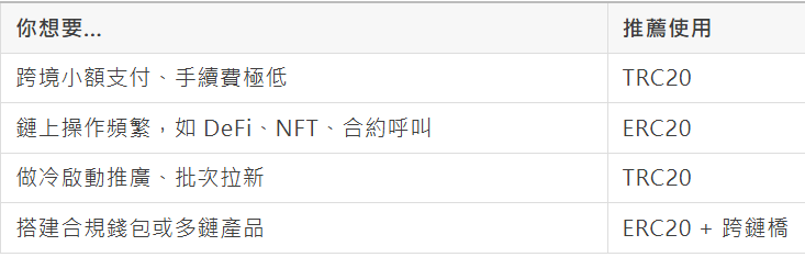 適合策略:TRC20 用於轉移 / 分發,ERC20 用於鏈上操作 / 資金保管