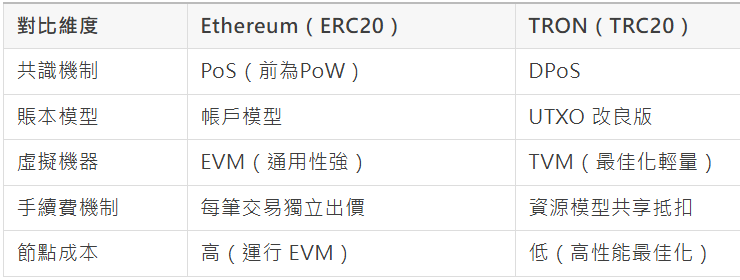 TRC20 與 ERC20 的差異,是一次“架構設計理念”的分野: