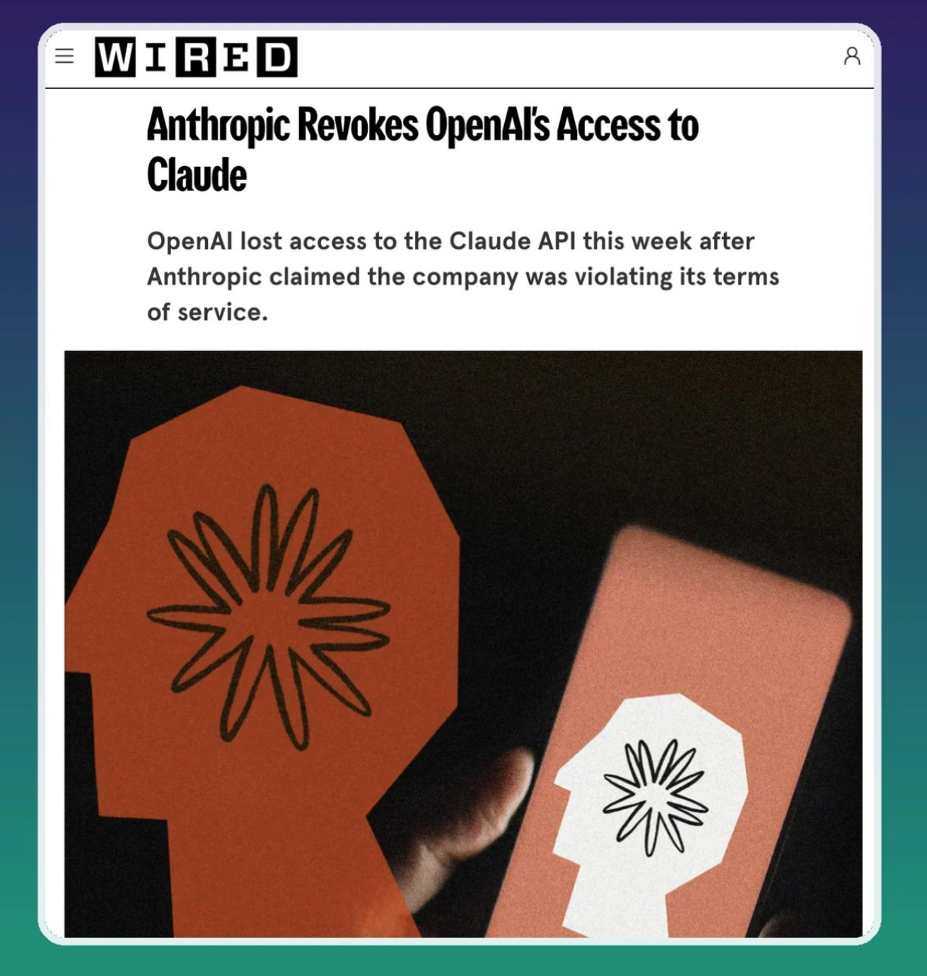 據連線雜誌報導,OpenAI被曝拿Anthropic Claude給自家即將發佈的GPT-5當互練,結果惹毛了,Anthropic Claude給自家即將發佈的GPT-5當互練,結果惹毛了,Anthropic Claude給自家即將發佈的GPT-5當互練,結果惹毛了Anthropic Claude,Anthropic以違反服務條款為由,突然切斷了OpenAI對Claude API存取權