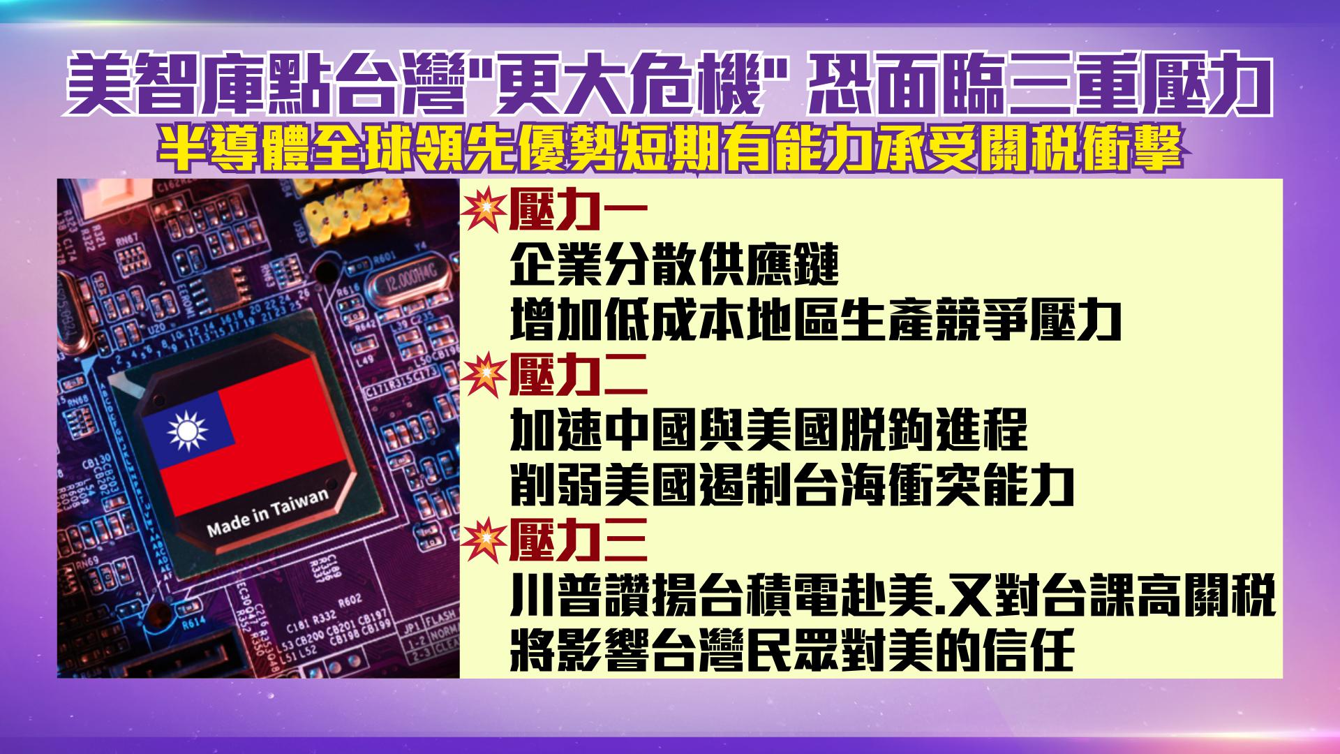 此外,川普一方面讚揚台積電赴美投資,另一方面卻對台課徵高額關稅,此舉無疑將影響台灣民眾對美的信任。報告也提及,雖台美有望在近期達成協議,但企業為避險持續將生產轉出中國,台灣低利潤產業因此面臨新興競爭壓力,同時安全層面的嚇阻力也逐漸減弱、經濟與政治風險升高,「台灣真正面對的挑戰,並非來自單一的關稅政策,而是從經濟轉型、安全戰略到政治信任的全面壓力」。