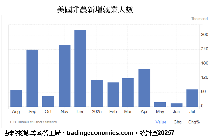 美國7月非農新增就業人數7.3萬人,遠低於市場預期的10.6萬人,甚至5月、6月份非農人數從原先的14.4萬人、14.7萬人,修正後僅剩1.9萬人、1.4萬人,令市場譁然。數據公布後,川普隨即下令開除勞工統計局長Erika McEntarfer,更是令人匪夷所思。