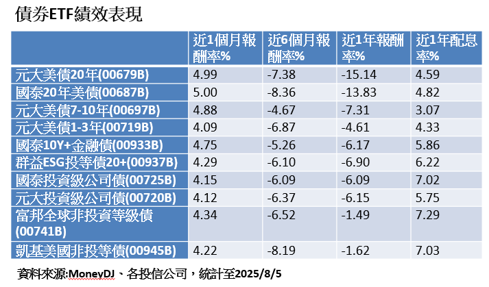 以表格內債券ETF為例,投資等級債、非投資等級債,目前還可以有5%-7%的息收水準,遠優於台幣、美元定存,仍是不錯的投資工具。
