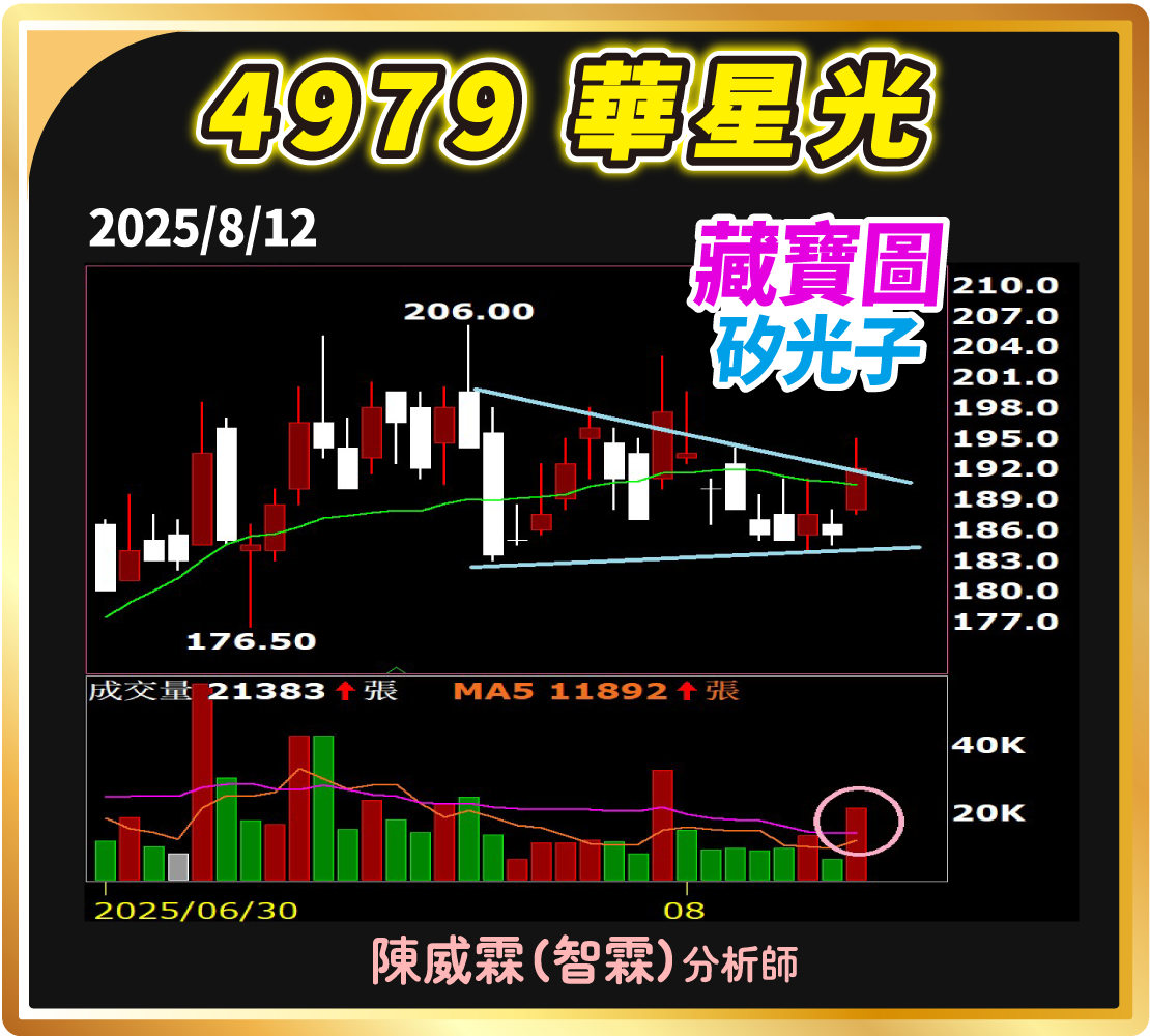 今天的主角並非權值龍頭,而是櫃買指數領軍的中小型股,資金明顯聚焦於低位階、低估值且題材具延續性的族群,矽光子族群就是典型例子,華星光(4979-TW)今日帶量突破191元關卡,盤中最高達195元,成交動能明顯放大,呼應智霖老師週末直播的觀察重點,正是本波藏寶圖中尚未發動的族群,驗證法人看好高速光通訊與AI資本支出成長,預期矽光子需求進入加速期。
