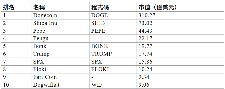 根據 2025 年 8 月最新市場資料,以下是按市值排名的十大 Meme 幣及其當前市值: