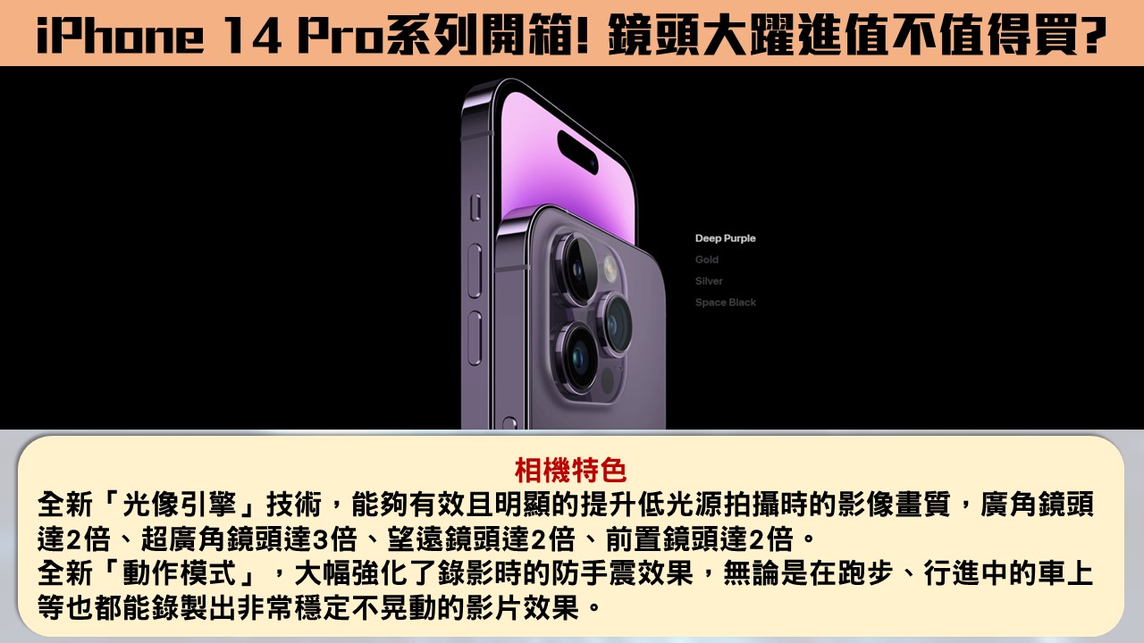 ●IPHONE14 Pro系列:突破了 Pro 相機系統三個固定鏡頭的框框,創出額外 2 倍長焦距,令變焦選擇更靈活,分別有 0.5 倍、1 倍、2 倍及 3 倍。