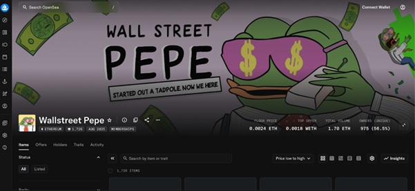 Wall Street Pepe於8月22日推出其NFT系列,首期為白名單錢包分配了2,500個鑄造席位。這些早期名額面向Alpha Chat成員和社區合作者開放,市場反應迅速——首輪已鑄造超過1,700枚NFT。