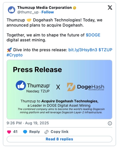 Dogehash股東將獲得3070萬股Thumzup股票,合併後的實體將更名為Dogehash Technologies Holdings, Inc.,並計畫在納斯達克以XDOG代碼交易。
