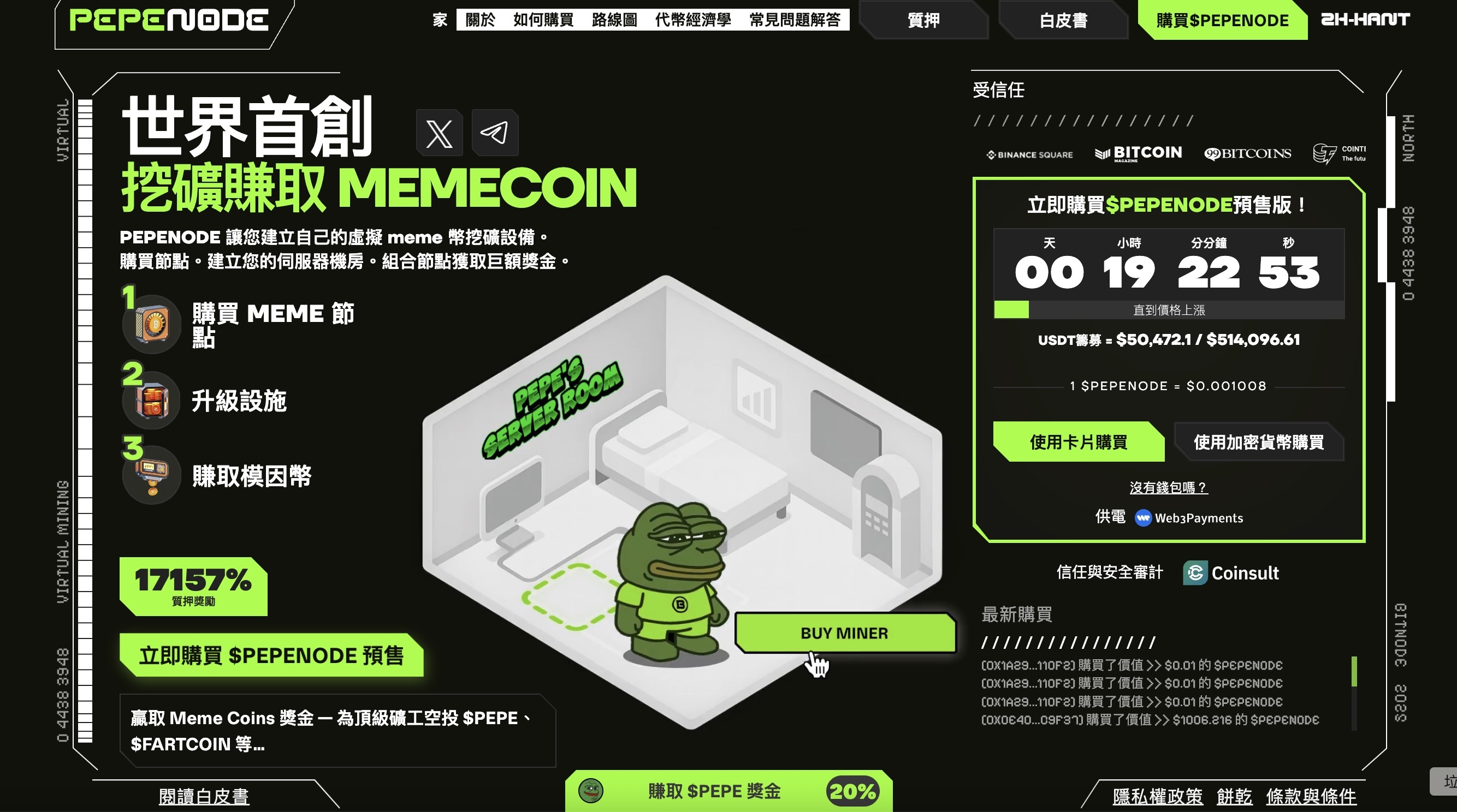 PepeNode —— 首個「挖礦即賺」迷因幣,預售已突破 50 萬美元!
