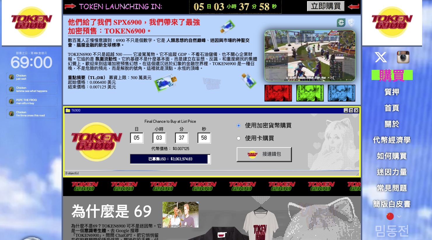 TOKEN6900($T6900)從未試圖掩飾其迷因本質,反而在自我戲謔中創造了極具市場認同感的敘事結構。作為SPX6900的「精神續集」,T6900延續了對傳統金融與宏觀數據的諷刺,並成功吸引一群理解其脈絡的核心社群參與。這種高度自覺的文化定位,反而使其在迷因幣同質化的市場中脫穎而出。