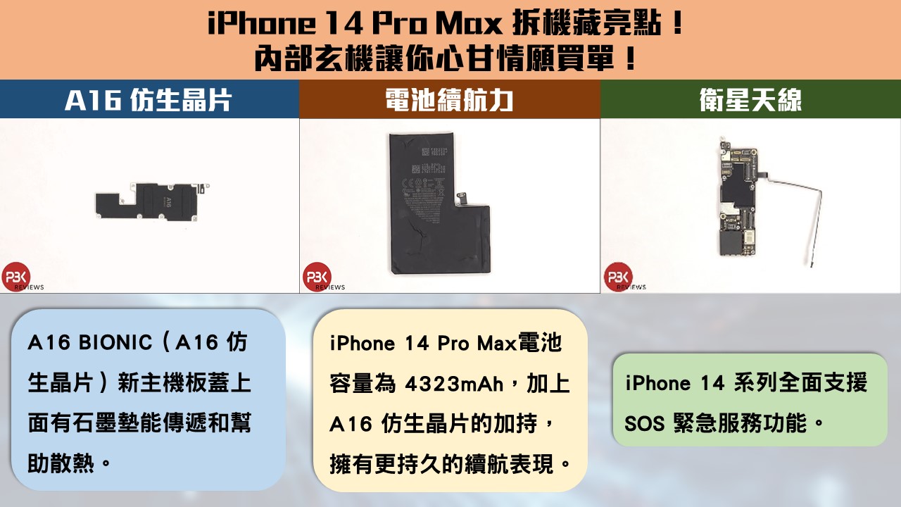 ●A16 仿生晶片:IPHONE 14 Pro Max 拆機並移除螢幕後,已能看到 IPHONE14 大部分的內部元件,機身左側主板上刻有「A16 BIONIC」的主機板蓋。其實這個刻有 A16 BIONIC(A16 仿生晶片)新主機板蓋實際上是個金屬板,上面有石墨墊能傳遞和幫助散熱。