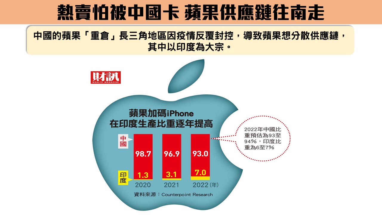 ●蘋果(Apple)近日上市新機型,蘋果供應鏈又再次受到關注,中國的蘋果「重倉」長三角地區因疫情反覆封控,導致蘋果想分散供應鏈,其以印度為大宗。