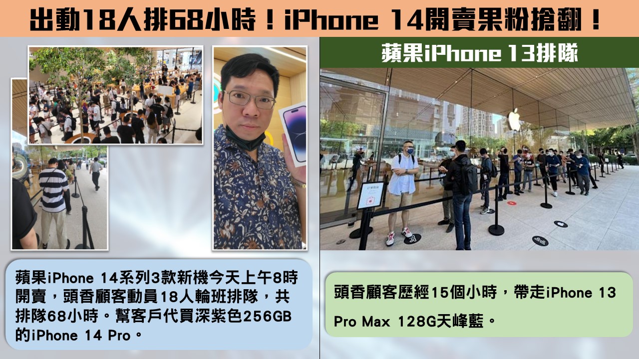 ●蘋果IPHONE 14系列3款新機2022年9月16日上午8時開賣,中華電信祭出排隊優惠,頭香許先生從2007年第一代IPHONE就成為果粉,從13日中午就動員18名員工輪班排隊,主要為了服務客戶,到今天開賣為止將排隊68小時。此外,蘋果直營店今天僅提供官網預購民眾取貨,無法現場購買。