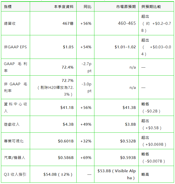 - GAAP 毛利率 72.4%、非GAAP 72.7%(若剔除H20釋放為 72.3%);GAAP淨利 $26.4B(YoY +59%);費用控制與高附加值產品結構確保利潤彈性。