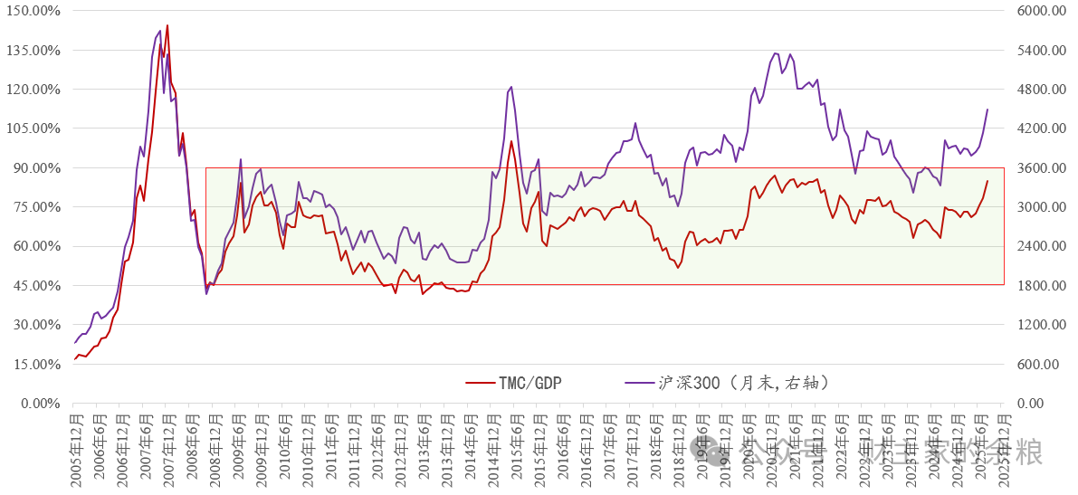 圖1,是A股的巴菲特指標自2005年以來的情況,目前是85%——這裡面的A股總市值,包含了A股上市公司在海外上市的市值(比方說,這裡計算的工商銀行市值,需要加上港股股份的市值)。該數值過去10年高於85%的月份只有3個月,分別是2021年1月份的87%、2021年6月份的85%和2021年12月份的86%。