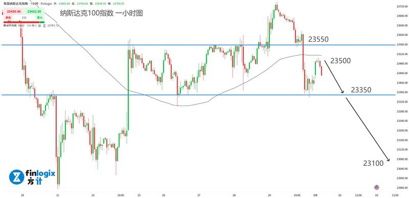 技術面:100均線保持水準,價格處在震盪整理期。那指受到消息面影響跌破23550關口回到震盪趨勢,在箱體結構中保持高位做空。一旦跌破箱體下沿,則跟隨看跌至前低點23000大關附近。