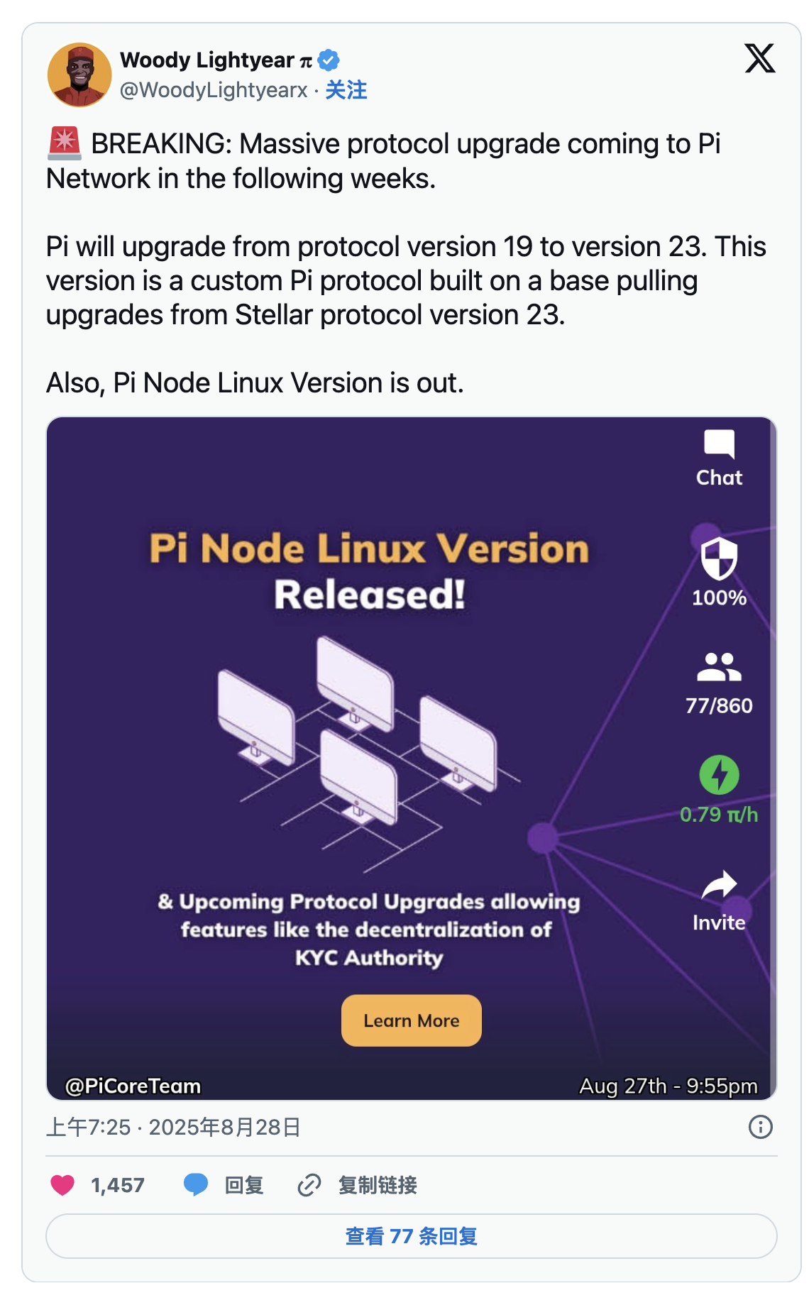 Pi Network也推出了Linux節點版本,擴展其支援以包含Mac、Windows和Linux,這個長期待求的更新為開發者提供了一種標準化的方式在基於Linux的系統上運行Pi Network節點。對於服務提供者和交易所而言,此版本消除了自訂建置的需求。這使得協議更新更為順利,並允許直接從網路進行自動更新。