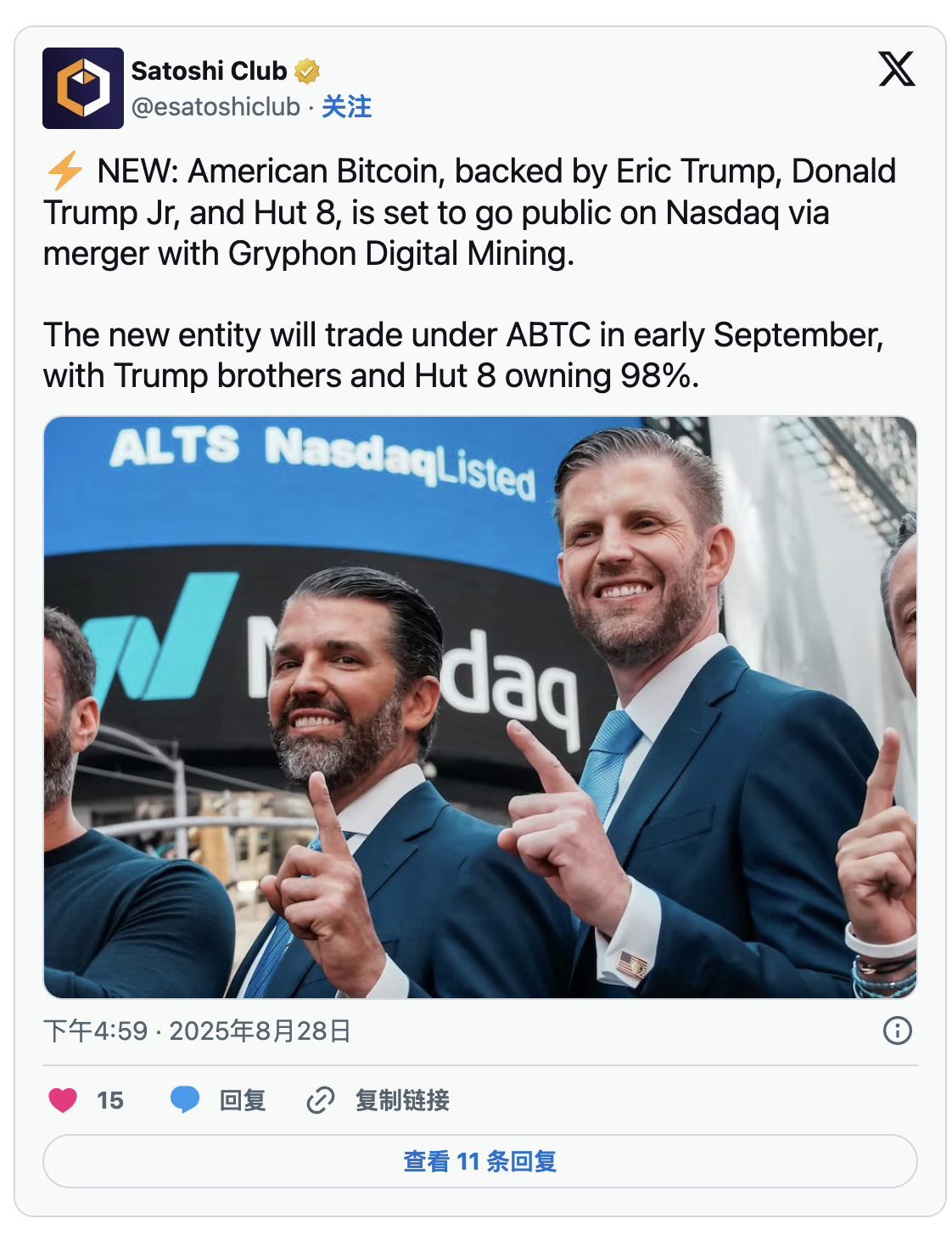 為比特幣的採用故事增添動力,由艾瑞克和唐納德·特朗普二世支持的礦業公司American Bitcoin將於今年9月透過與Gryphon Digital Mining合併在納斯達克上市。