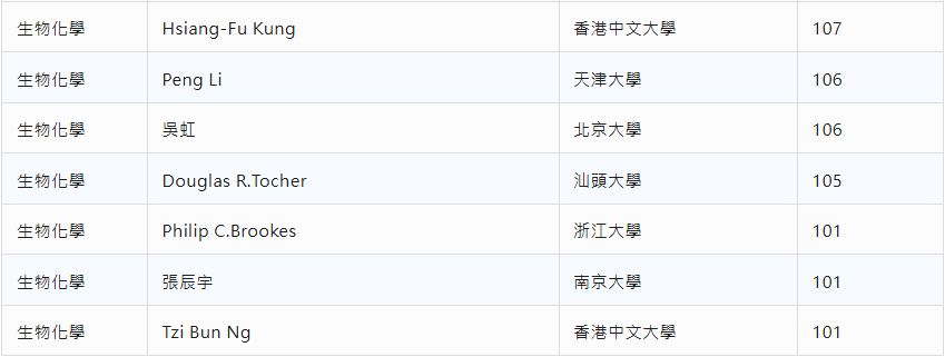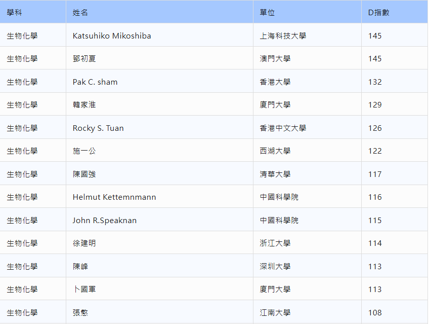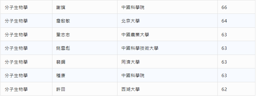 對於生物化學領域:鄧初夏,韓家淮,施一公,陳國強,徐建明,陳峰等人入選;
